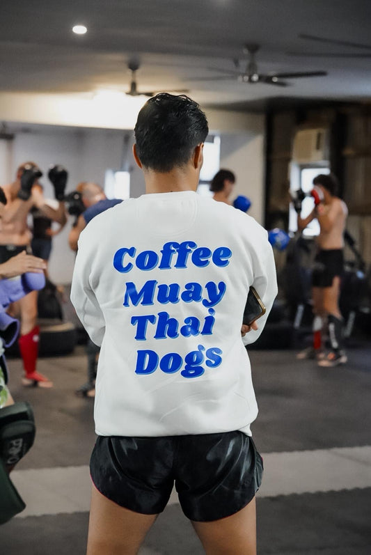 LIMITED RELEASE - Retro Blue Three Things Thai Sweater - Coffee, Muay Thai, Dogs